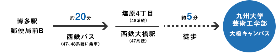 市営地下鉄利用(天神で乗り換え):所要時間 約30〜40分